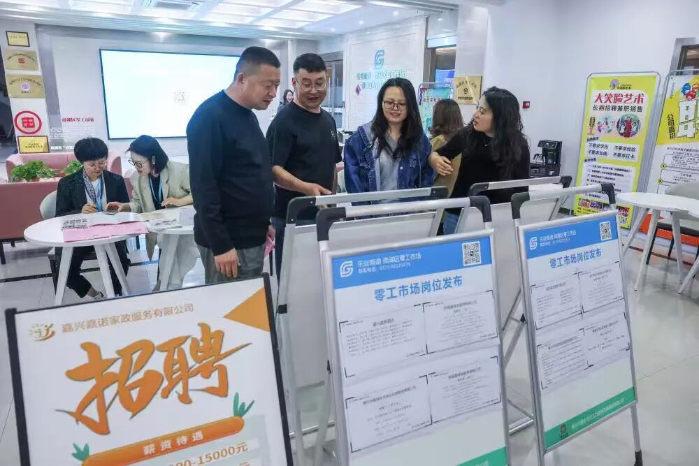 5月8日,在浙江省嘉兴市南湖区零工市场的一场零工招聘会上,求职者查看各类岗位。来源:新华社